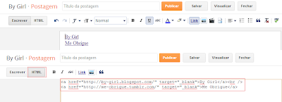 Agora, pare conseguir o código dos links, deixe a janela aonde você está criando o gadget e vá em nova postagem e escreva todos os links, agora clique em HTML e copie o código que está lá, assim:<div class="divspoiler"><img src="URL DA IMAGEM" onclick="if (this.parentNode.nextSibling.childNodes[0].style.display != '') { this.parentNode.nextSibling.childNodes[0].style.display = ''; } else { this.parentNode.nextSibling.childNodes[0].style.display = 'none';}" /></div><div><div class="spoiler" style="display: none;">Aqui o código dos links</div></div>